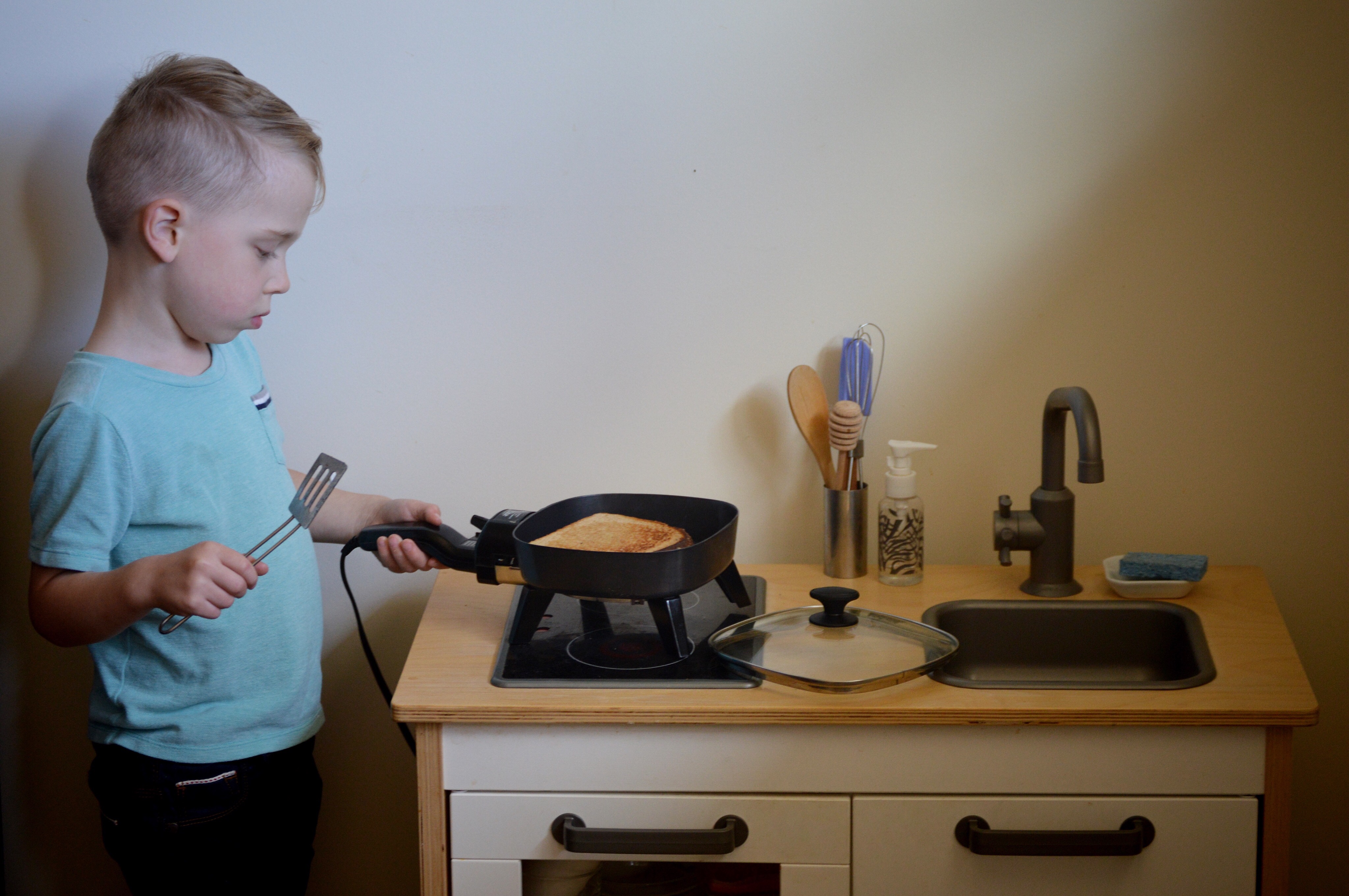 Back at home, and groceries put away, he decides on a hot sandwich to have with his fruit and veggies. A real child sized kitchen is essential in the Montessori Home environment. This is were Practical Life began all those years ago. Now, he stands quietly concentrating. He knows the skillet is hot and requires his attention.