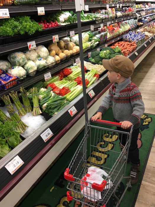 We have come out of the forest and into the grocery store for lunch necessities. Small carts and lots of patience from adults help a child contribute to the family food prep.