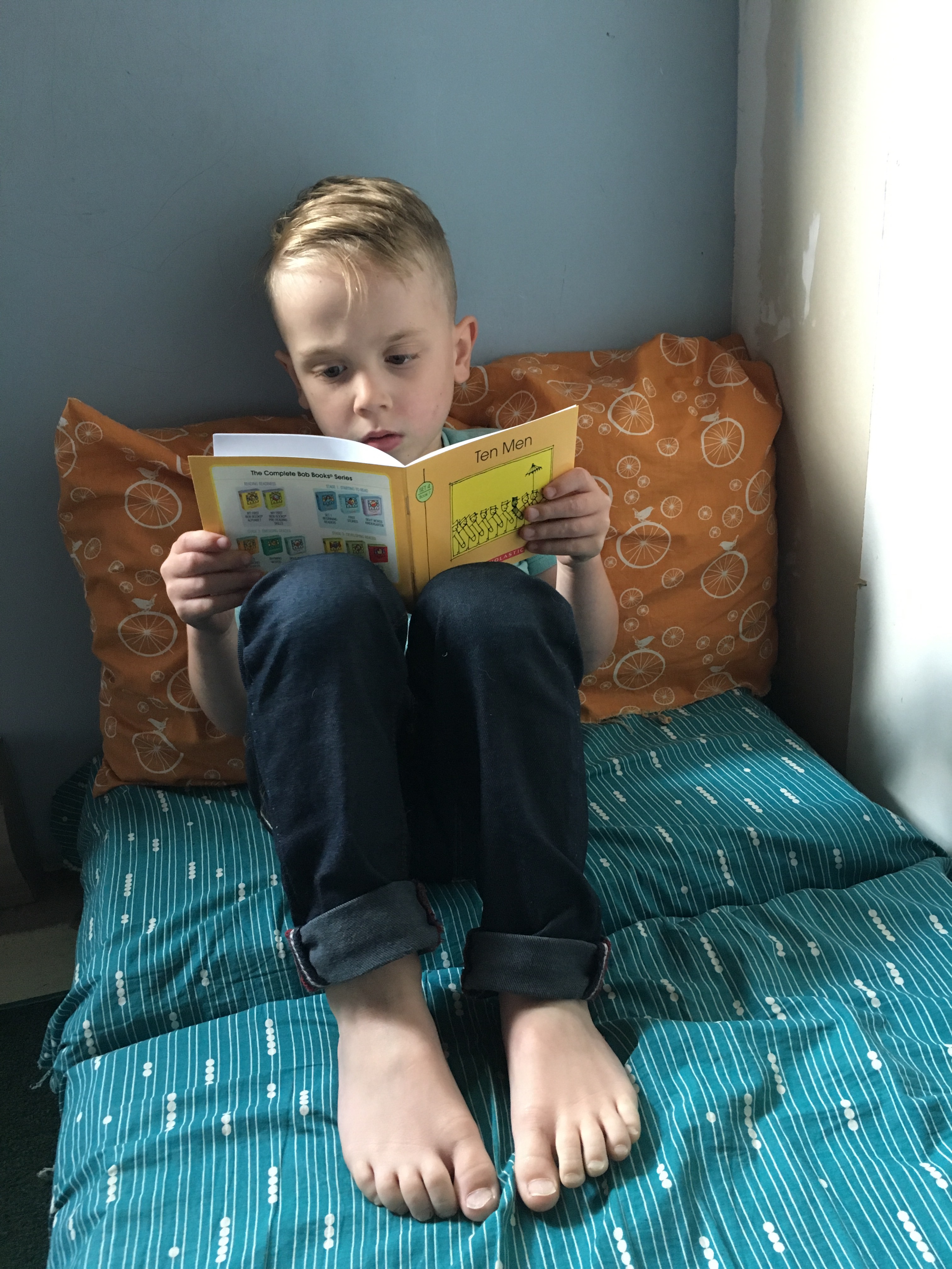 His reading is really picking up. He can read most CVC words and is beginning to work on phonograms. He chooses to come to his work space after lunch and get out his current reader.