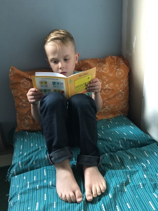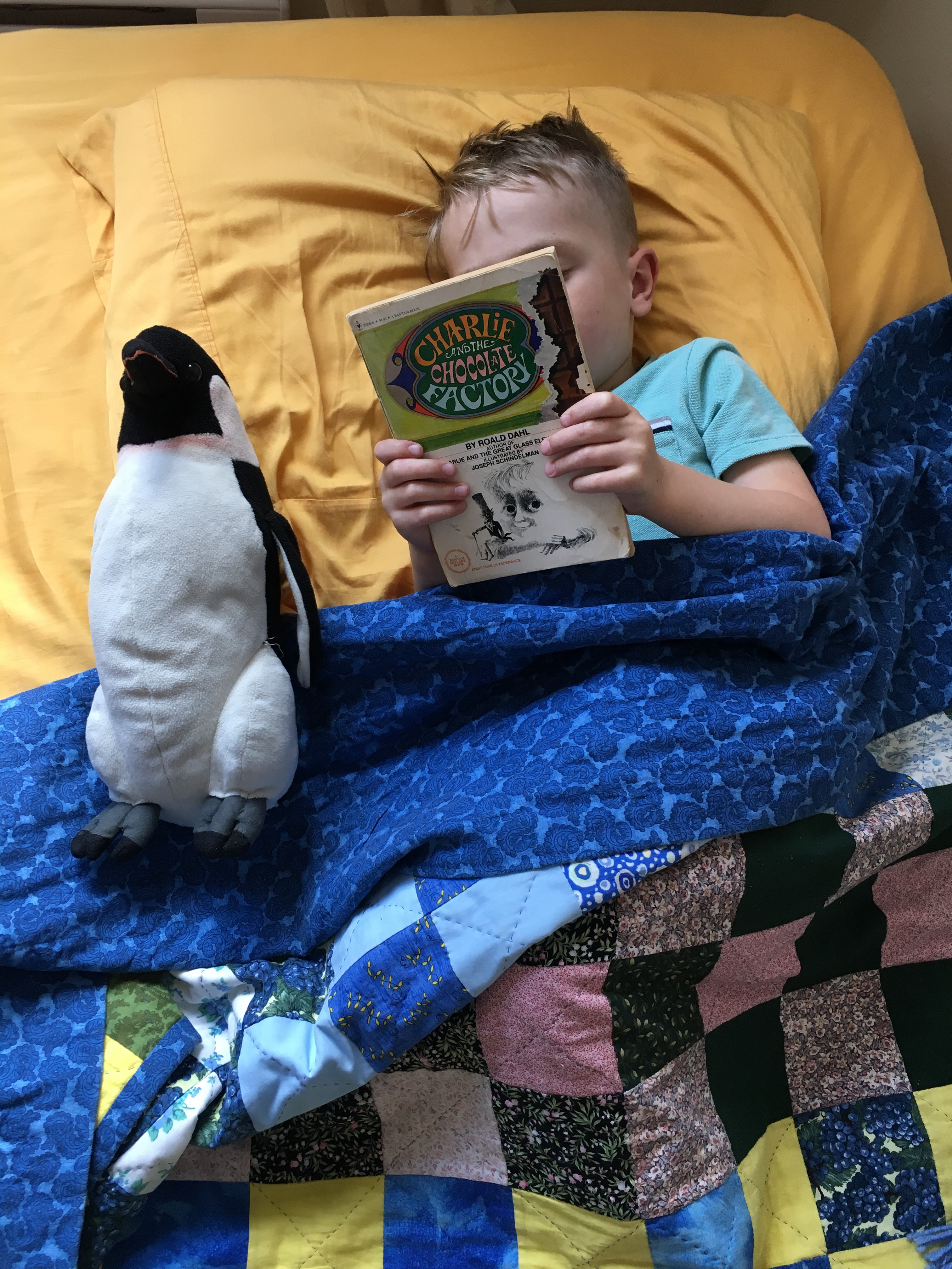 I find him in bed holding our current chapter book. “I’m ready for my rest Mama.” He is asleep before I finish reading 2 chapters. He usually naps 2-2.5 hours.