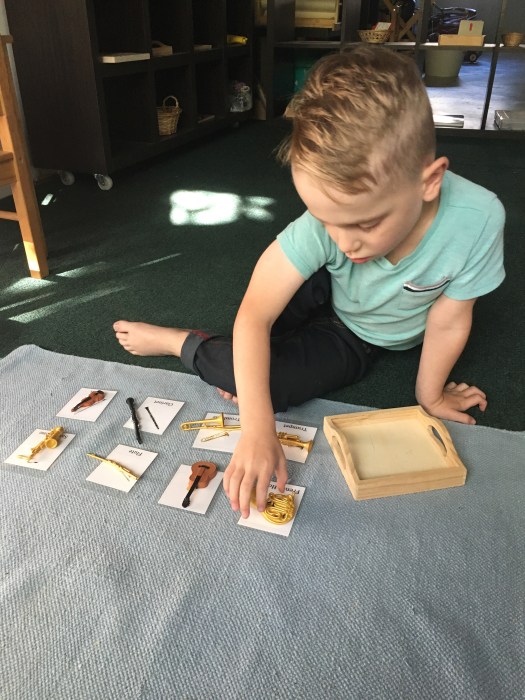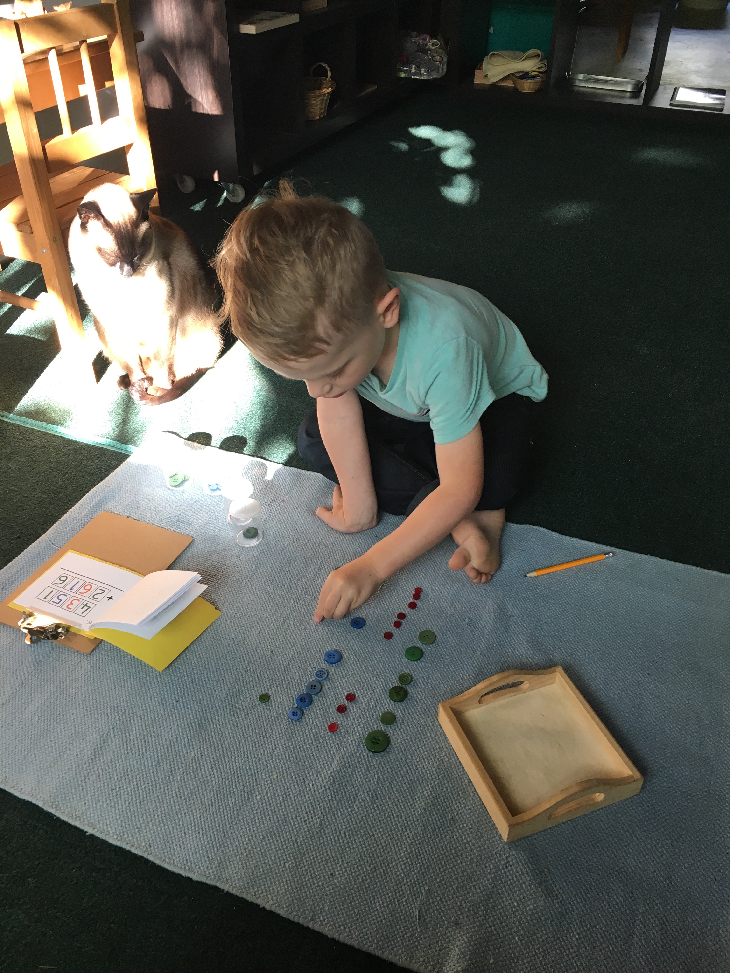 Up from his nap and a tummy full of snack, he goes to his work space and freely chooses work. The light has changed. This room gets the afternoon sun and it’s interesting to observe Quentin in this space. In the quiet blue light of the morning, his work is slow, and simple. In the afternoon light, it changes completely into quick paced and purposeful. He works quickly laying out materials, finishing, and getting out the next thing.