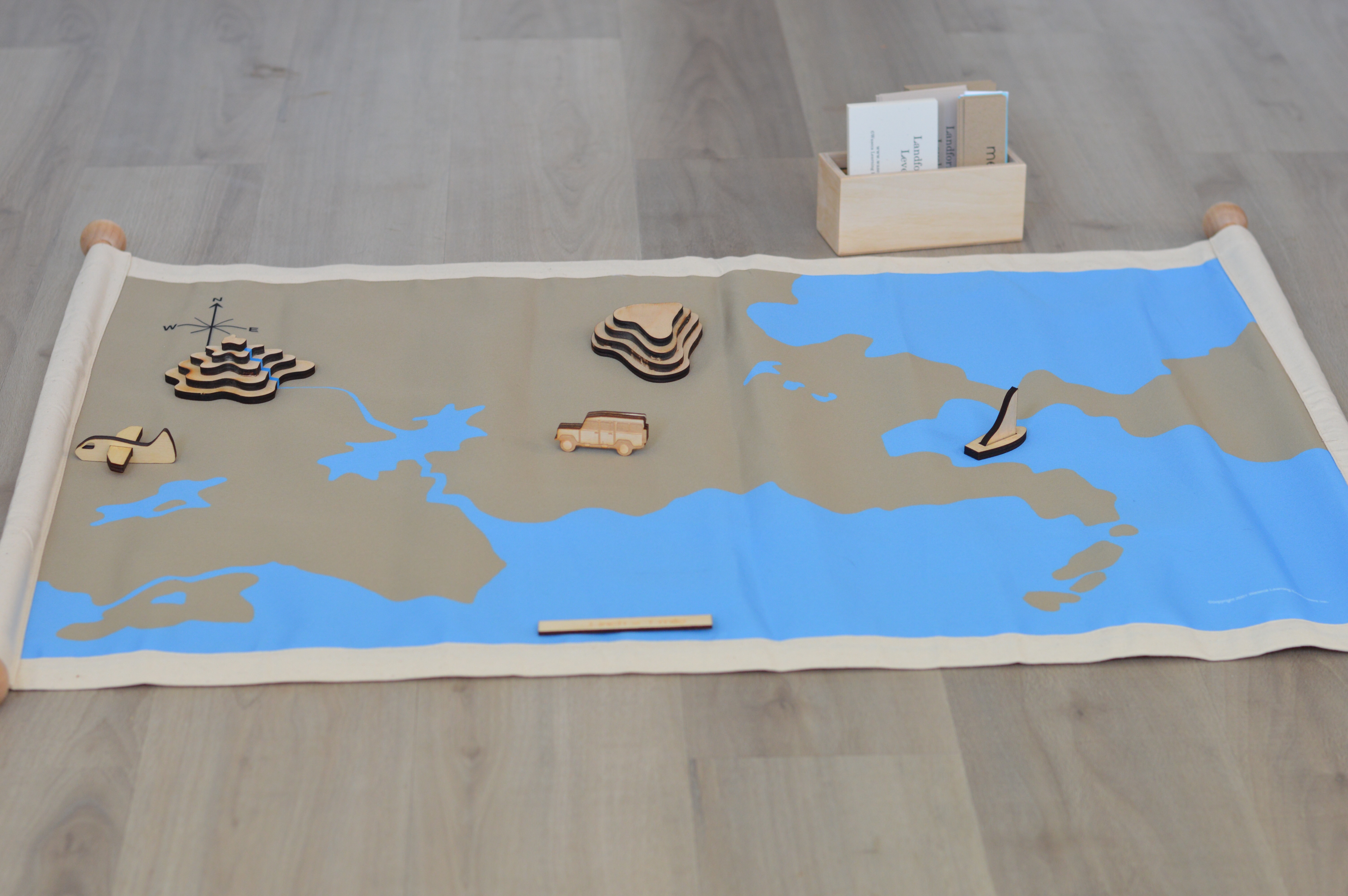 We recently purchased the Landforms Mat and we have been continuing the work Quentin has done in his 3-6 classroom with the landforms. It is an awesome material because it brings the landforms together in a holistic way while gently moving into the abstract. Quentin loves following the prompts from the Level One cards such as “Fly, drive or sail to a body of water surrounded by land on 3 sides. Above he chose to move his sailboat to the Peninsula. There is a Level Two set and Level Three set included so this material will be relevant to him for years to come.