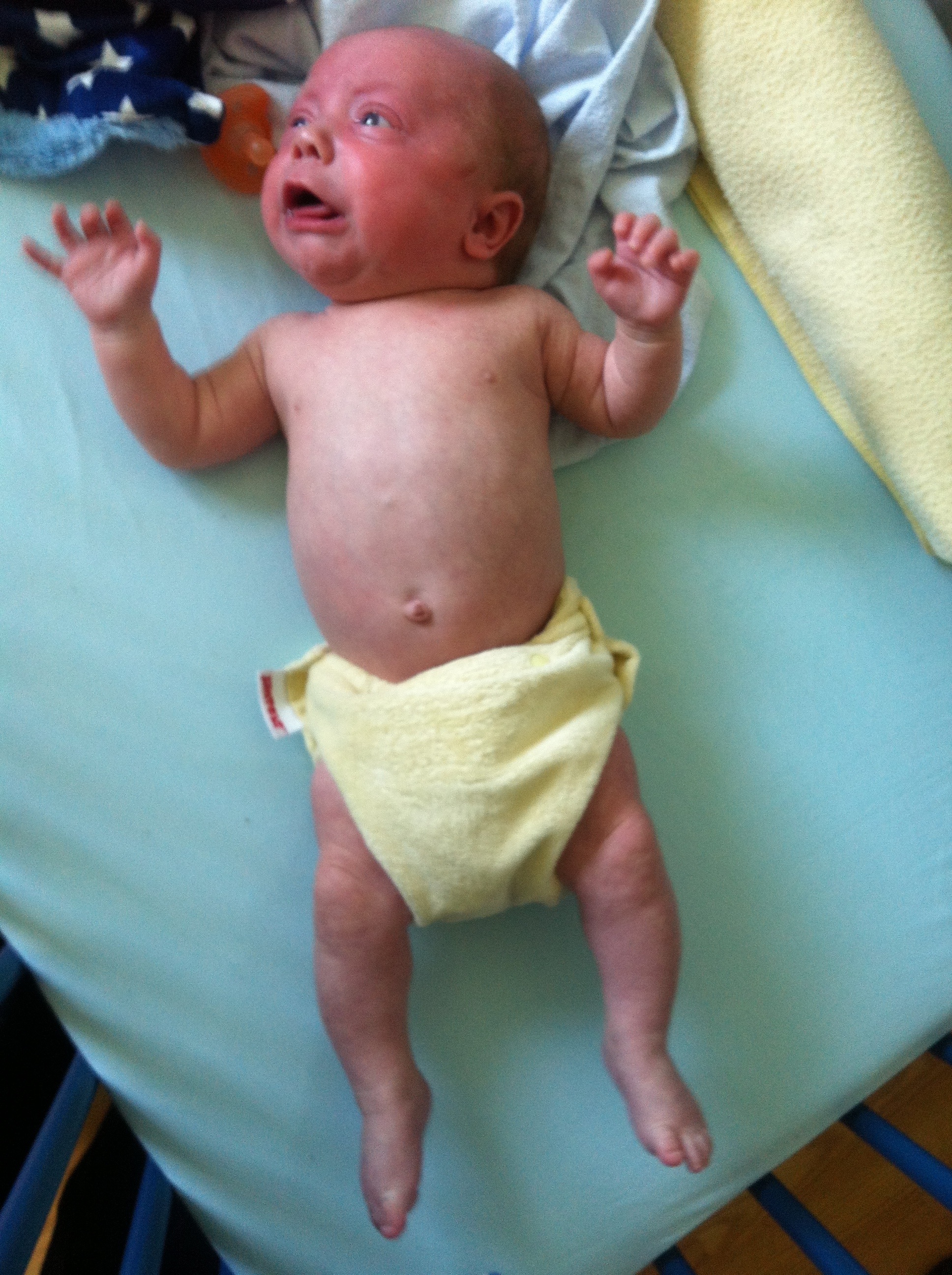 If they make cloth diapers for preemies, we certainly couldn’t find them around here. The beautiful soft cloth diapers were bulky, hot and hard to move around in. He got frustrated and so did we.