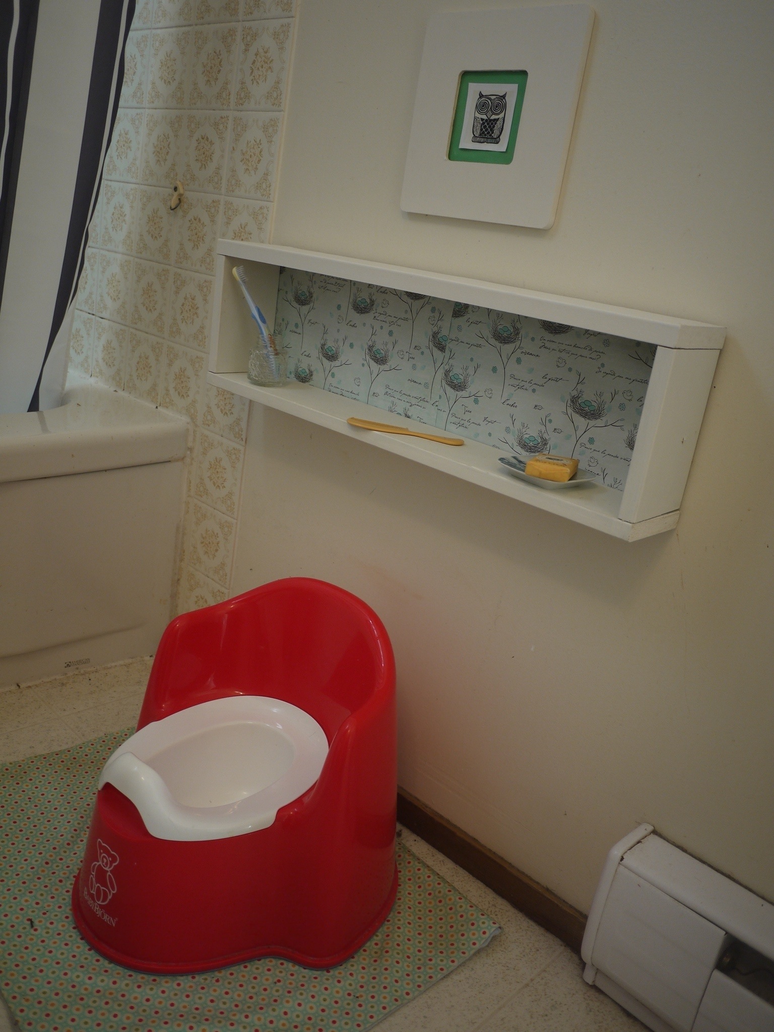 I made the small shelf out of 1/2 metre of trim, some pretty scrapbook paper and a cereal box back. I ordered some pretty laminated fabric with a red that matched the potty (because yes, I’m that person) and made a little waterproof pad. We have the worlds smallest bathroom. We needed something that worked without getting in the way. The shelf holds Quentin’s tooth brush, comb and soap with dish nicely.