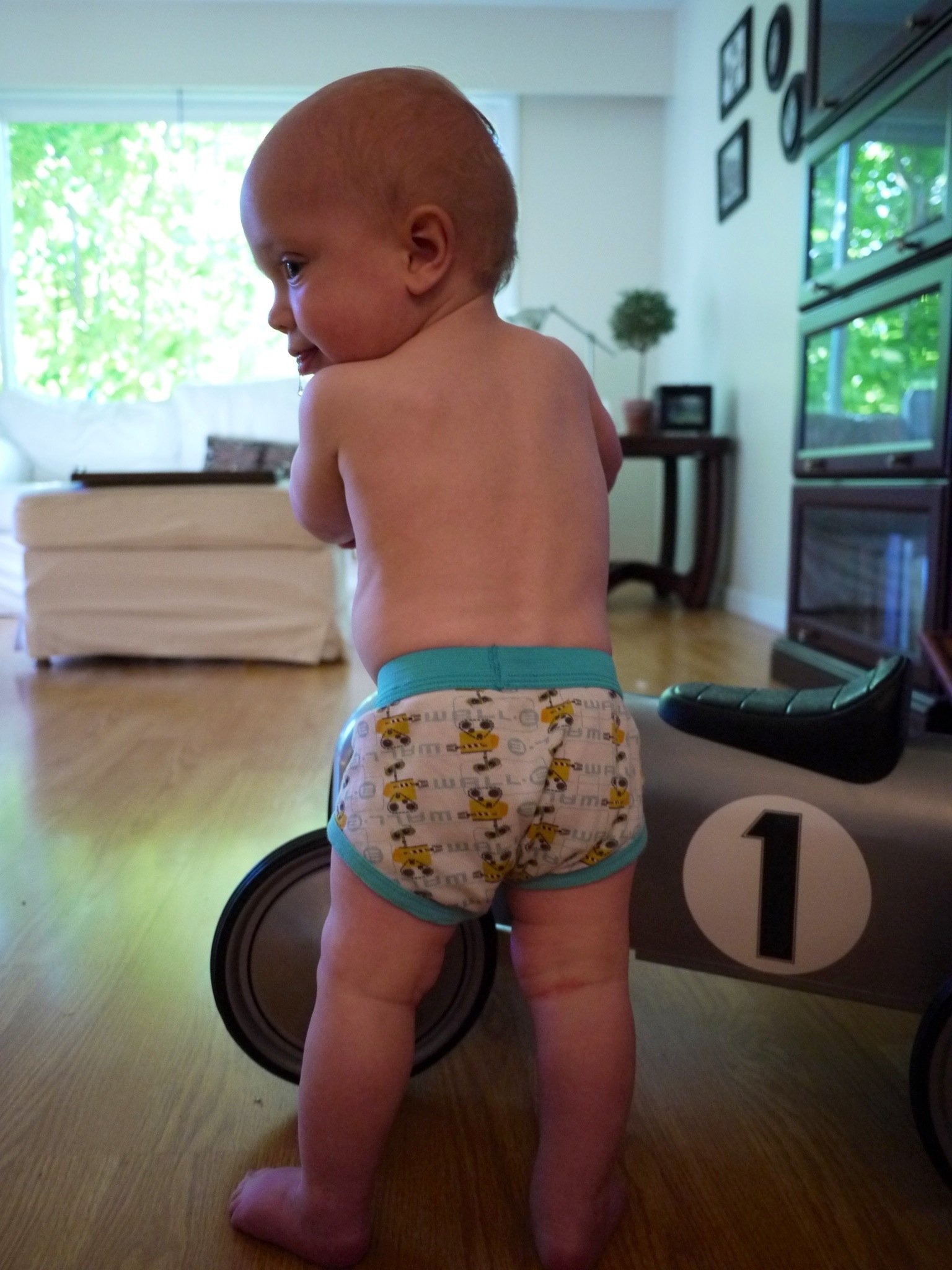 At 14 months (12 1/2 corrected age) Quentin has been successful in staying dry all day (including naps) for the past 3 days. We continue to take him, and he lets us know by yelling if we’ve left it too long. We’re trying to add the ASL sign for toilet to his repertoire of signs. He takes pride in “going,” saying “I did it” and flushing the toilet after I empty the potty. We (here comes my disclaimer) have never used rewards of any kind, nor punishments for Quentin. When he has an accident, we will ask “Did you pee in your underwear?” He will usually answer with his noise for yes. Then we walk him to the bathroom and help him get into clean clothes and wipe up any mess. We never shame or scold him. Just carry on with our day.