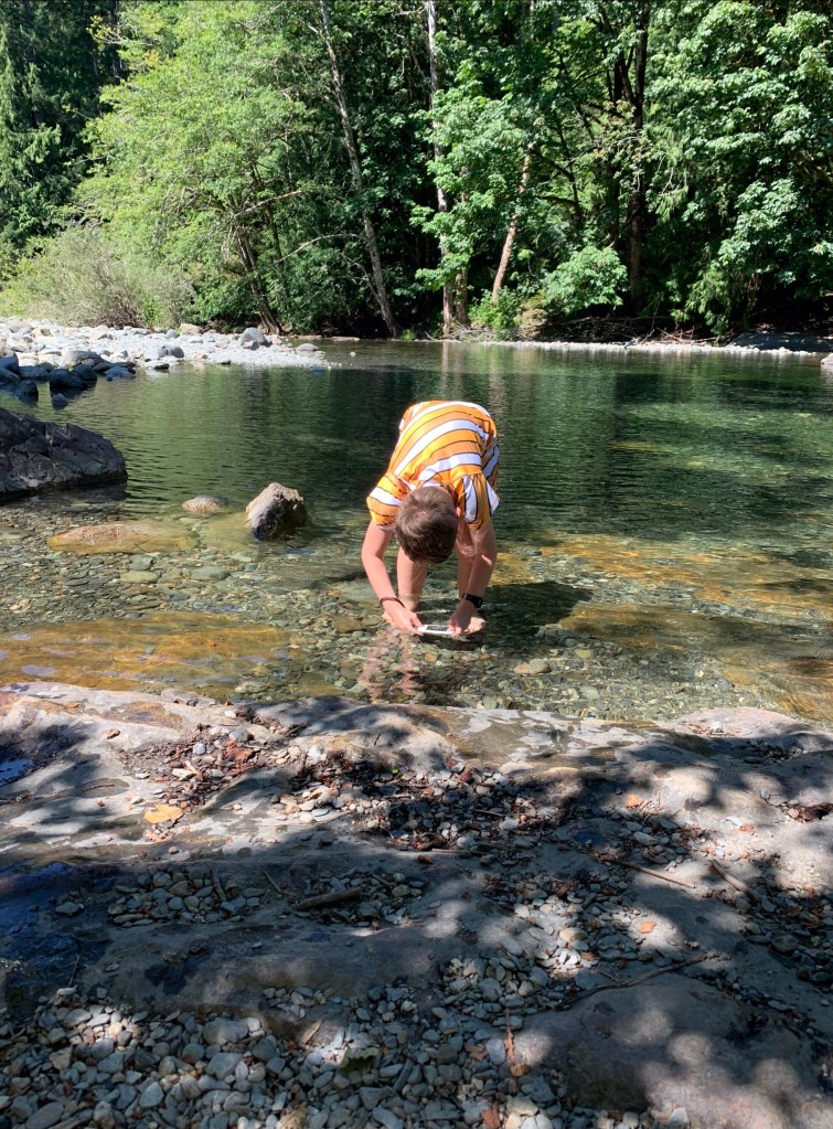 It’s amazing what we as adults don’t give kids enough credit for. Quentin carried his new bike down a dry river bed navigating boulders and slippery logs to reach the lower trail and our destination. It was a lot of work, or it must have been. Looking back all we can remember is laughing at some ridiculous jokes and talking about what we would do when we reached the pool. He used his camera to take some amazing shots of the minnows swimming.