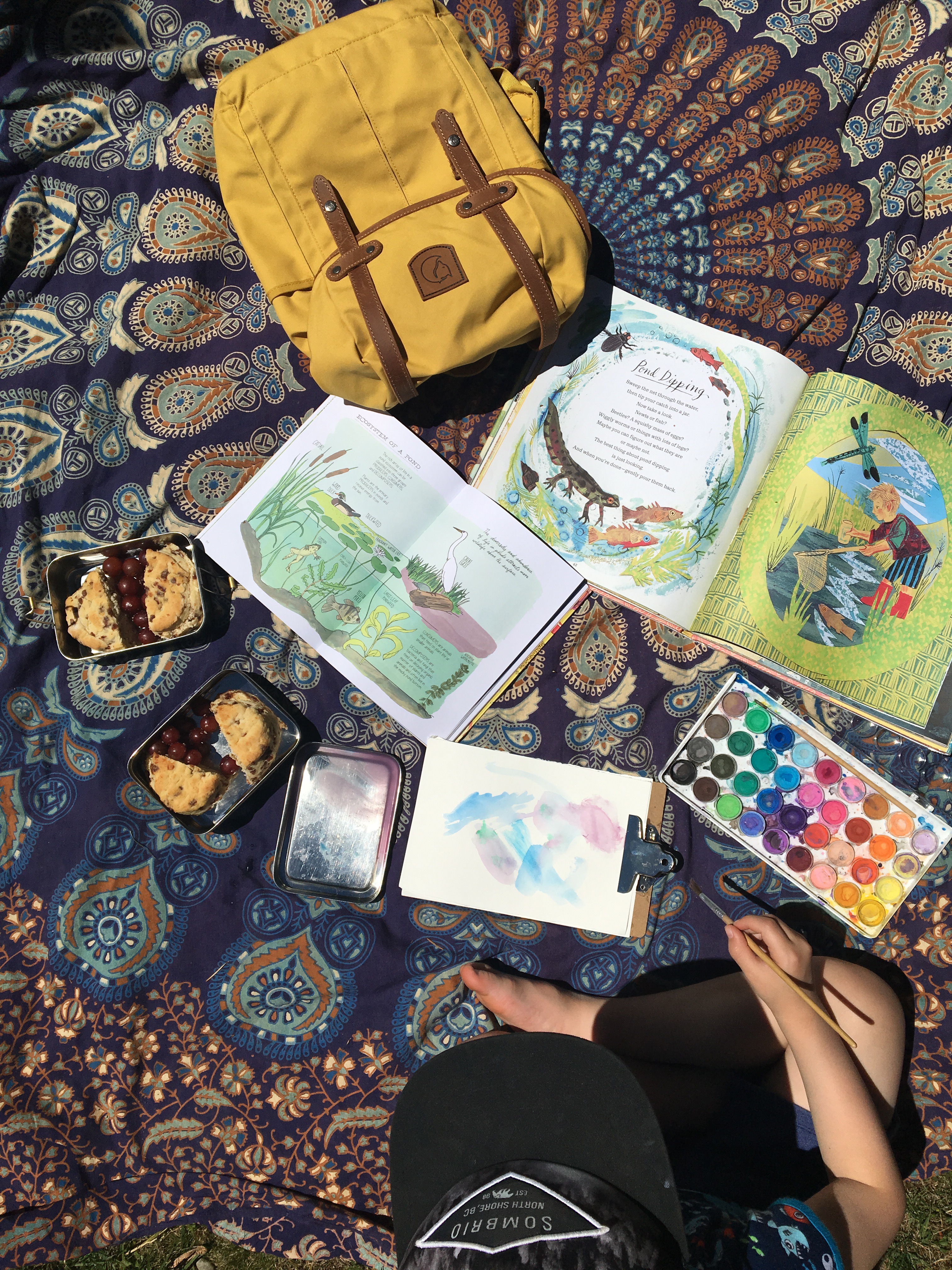The lily pads are in full bloom at our local freshwater pond. We often take art supplies with us in a backpack as well as some snacks and a blanket to make a day of it.