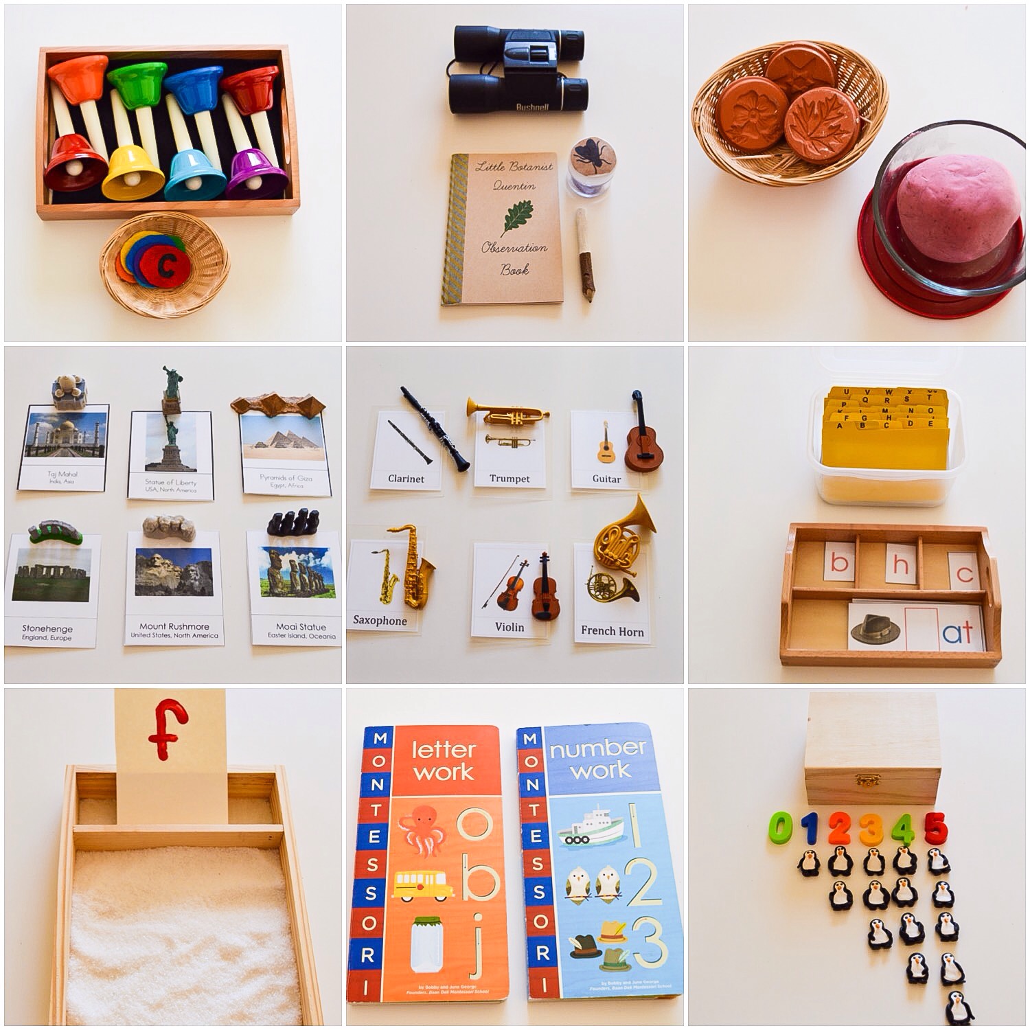 Bottom Row: DIY Salt tray & tracing cards, Montessori Letterwork/Numberwork books, Number/Quantity Recognition (up to 10 in the box)