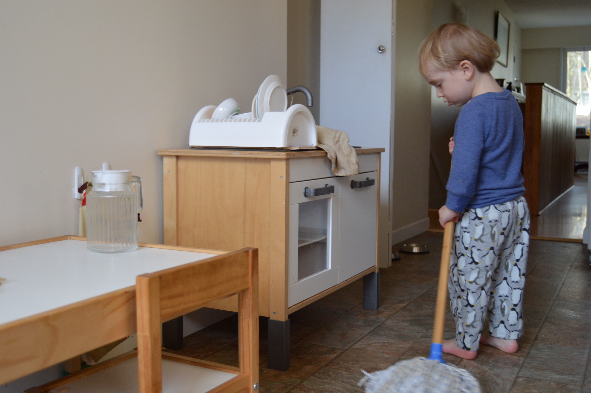 This is what Practical Life now looks like. All the baking, cleaning, laundry etc. of our family, he is invited to assist with. Most of it he can do himself. He continues to love his kitchen (sold here). I get a lot of questions about his kitchen set up. “Real or play kitchen? What about play food?” My answer is always the same. The things in this space are all real. Real food prep, real consuming, real mess, real clean up. His kitchen continues to store his dishes, and silverware on the left (real porcelain seen here & real glasses) and his food prep tools (mixing bowl, egg slicer, cutting board & knife etc.) on the right. He stores his cleaning supplies and tools as well as his overflow baking supplies in the closet we have renovated for him beside his sink (inside seen here).
