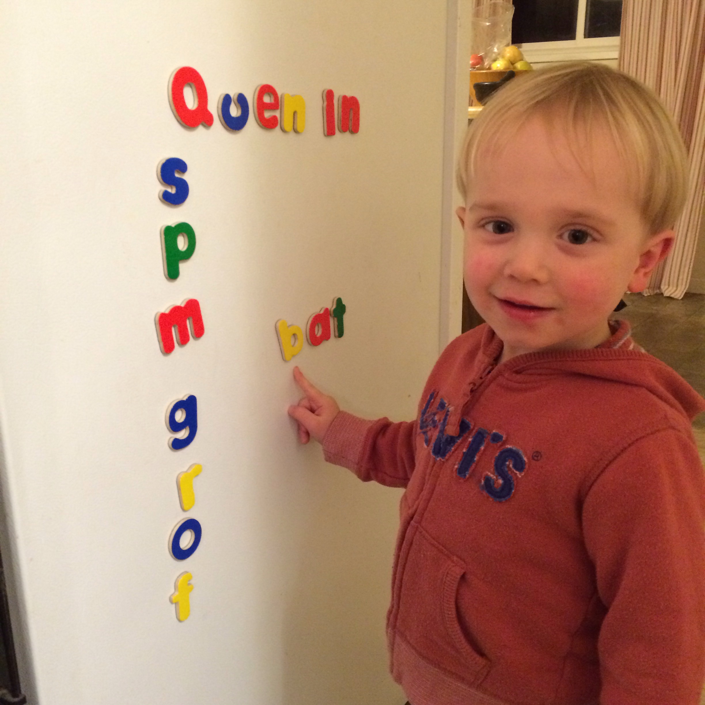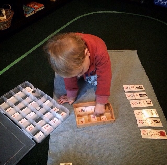 This was taken December 1, 2014. He had just turned 31 months. By then, the intensity with which he was seeking language was at a peak. He had started school in September and now his home Montessori materials could be supported by the traditional Montessori classroom materials. He quickly mastered all the phonetic letter sounds. Then he slowly began to realize he could manipulate the letters to make different sound groupings. In other words, he could make words. “A, t, at” he would sound. Then he would place another beginning sound in and start again.