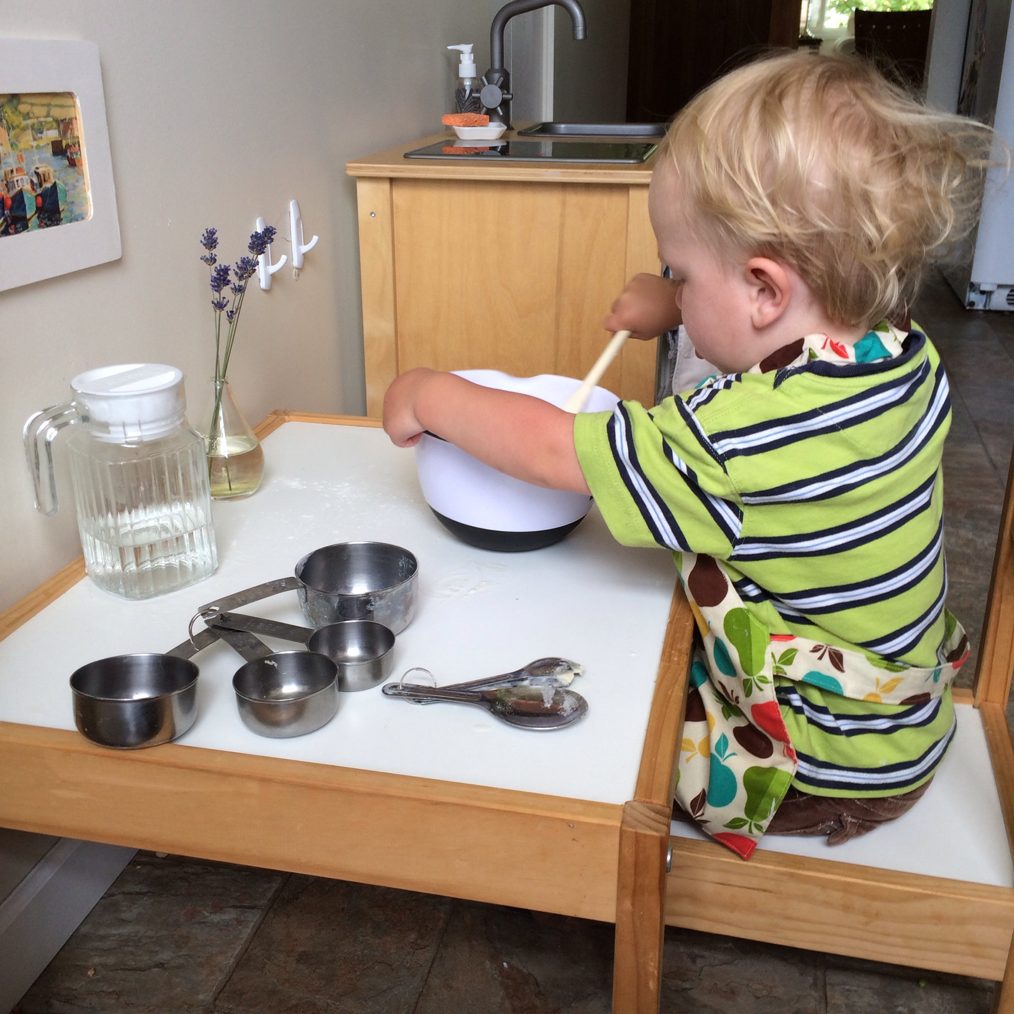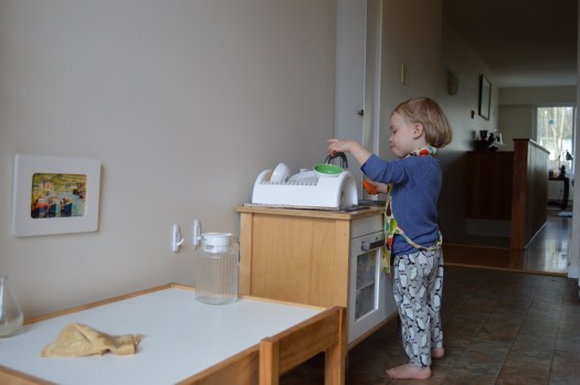 This is what Practical Life now looks like. All the baking, cleaning, laundry etc. of our family, he is invited to assist with. Most of it he can do himself. He continues to love his kitchen (sold here). I get a lot of questions about his kitchen set up. “Real or play kitchen? What about play food?” My answer is always the same. The things in this space are all real. Real food prep, real consuming, real mess, real clean up. His kitchen continues to store his dishes, and silverware on the left (real porcelain seen here & real glasses) and his food prep tools (mixing bowl, egg slicer, cutting board & knife etc.) on the right. He stores his cleaning supplies and tools as well as his overflow baking supplies in the closet we have renovated for him beside his sink (inside seen here).