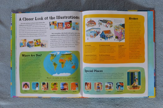 The best part about this book (aside from the gorgeous artwork) is the reference section. This book is such an excellent starting point to teach Peace Education in the 3-6 year old classroom but it is also excellent for teaching the Fundamental Needs lessons in the 6-9 and 9-12 year old classrooms. Each of the pages of the story are complemented with more details in the reference section. This is where we discover all of the different languages featured in the picture above. Quentin loved learning what languages they are and what the translation is.