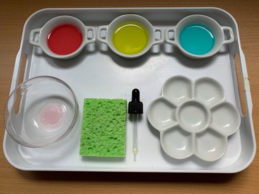 For the 3-6 age group, an easy to carry tray with the primary colours and a slotted dish, a bowl to dump used water and a sponge for clean up make colour mixing exciting. Children at this age love to experiment with each of the primary colours and it’s still very much about the process here. In the classroom we talk about their favourite colour, what happens when you mix blue with red, red and yellow, yellow and blue, but for the most part they are experimenting and absorbing the experience of those experiments.
